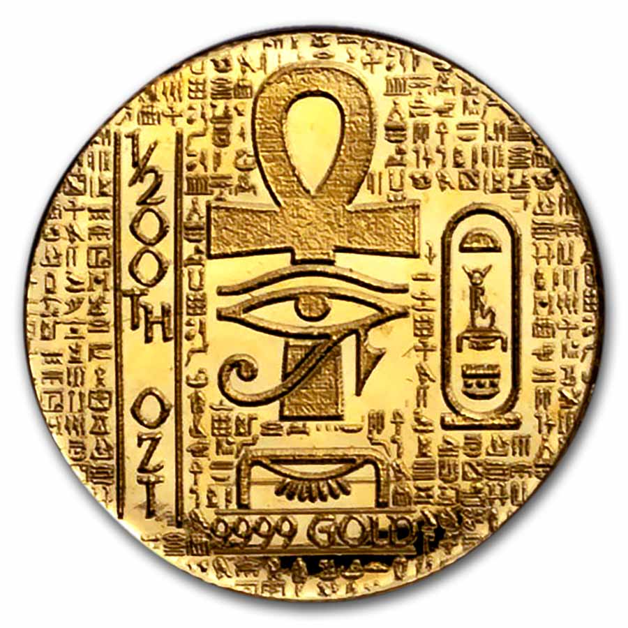 • Obverse: Displays the Egyptian hieroglyphic for Gold, Nebu. Above that is the Egyptian Ankh symbolizing life with the Eye of Ra inside. Metal content, weight, and purity are also listed.